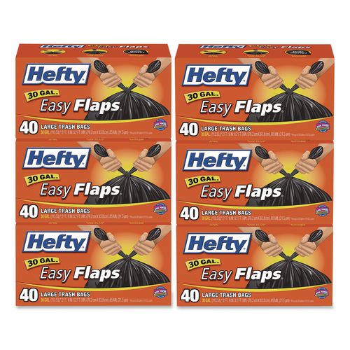 Easy Flaps Trash Bags, Tie-Flap, 30 gal, 0.85 mil, 30" x 33", Black, 40 Bags/Box, 6 Boxes/Carton